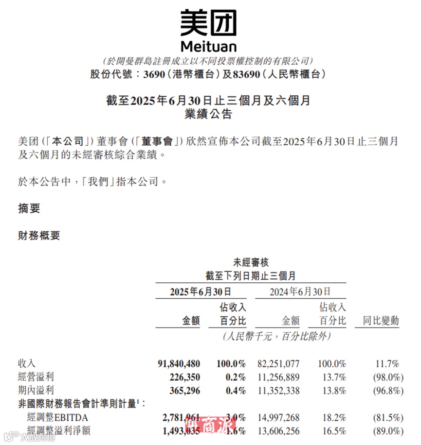 美团发布的2025年第二季度财报显示,公司营收达918.4亿元,同比增长11.7%;但净利润仅为3.65亿元,同比暴跌超90%。经调整净利润为14.9亿元,较去年同期的136亿元下降89%。