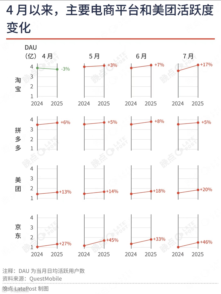 即时零售的拉动效应显著。QuestMobile数据显示,2025年4月淘宝App日活为3.74亿,到7月已增长17%,涨势强劲。