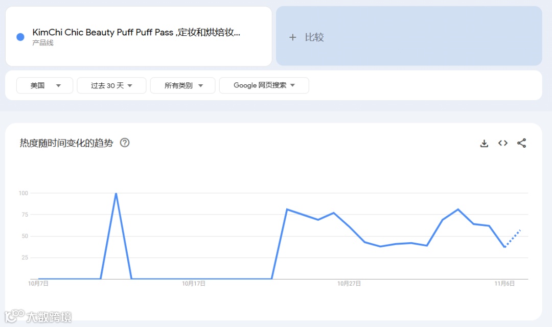 通过Google Trends我们可以了解到一定时期内,产品关键词在搜索引擎上的搜索热度和市场趋势。输入产品关键词可以看到,过去一个月内,有关这款定妆散粉的热度正快速上升。