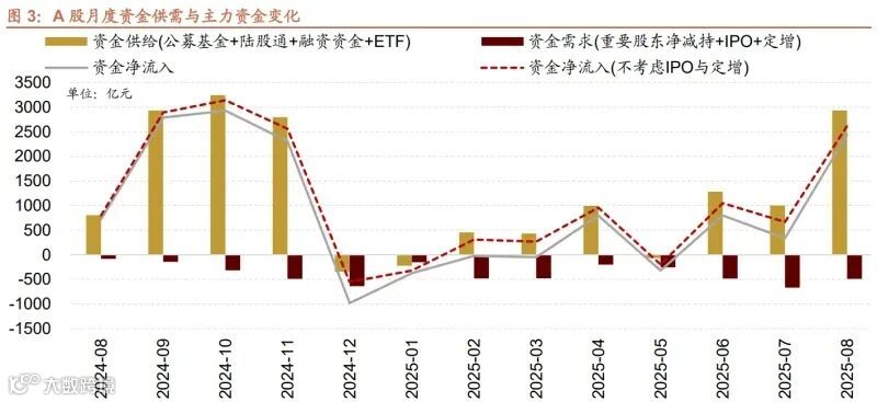 当前增量资金以融资余额、私募备案、外资成交为主。8月融资净流入2574亿元,私募新增备案793亿元,外资月均成交额达2942亿元,创历史新高。IPO与再融资规模下降,资金需求减弱,供需格局有利。