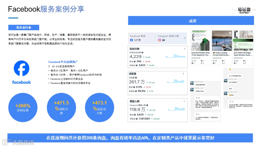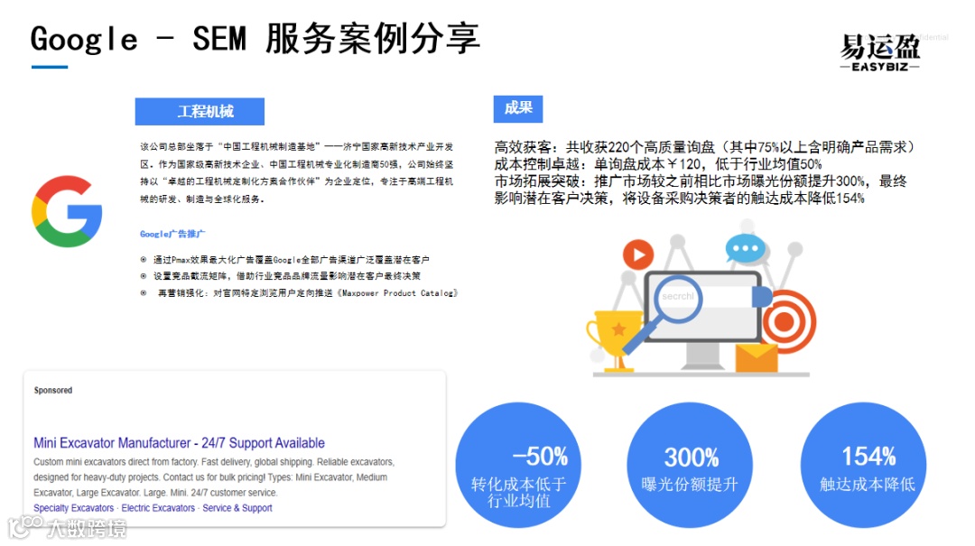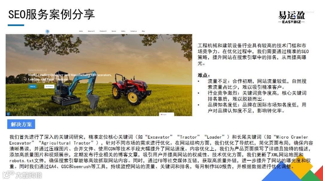 易运盈服务已在多个行业实现可验证成果:谷歌SEM助力企业优化获客成本并提升转化效率;Facebook运营实现品牌互动量与询盘量双增长;SEO服务推动机械行业网站流量与询盘显著提升。真实数据印证服务实力。