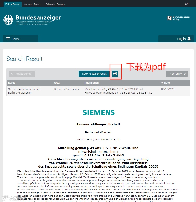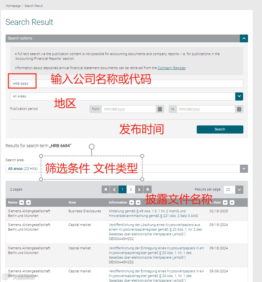 在搜索栏输入“Siemens Aktiengesellschaft”,结果可按地区、发布日期等条件筛选。