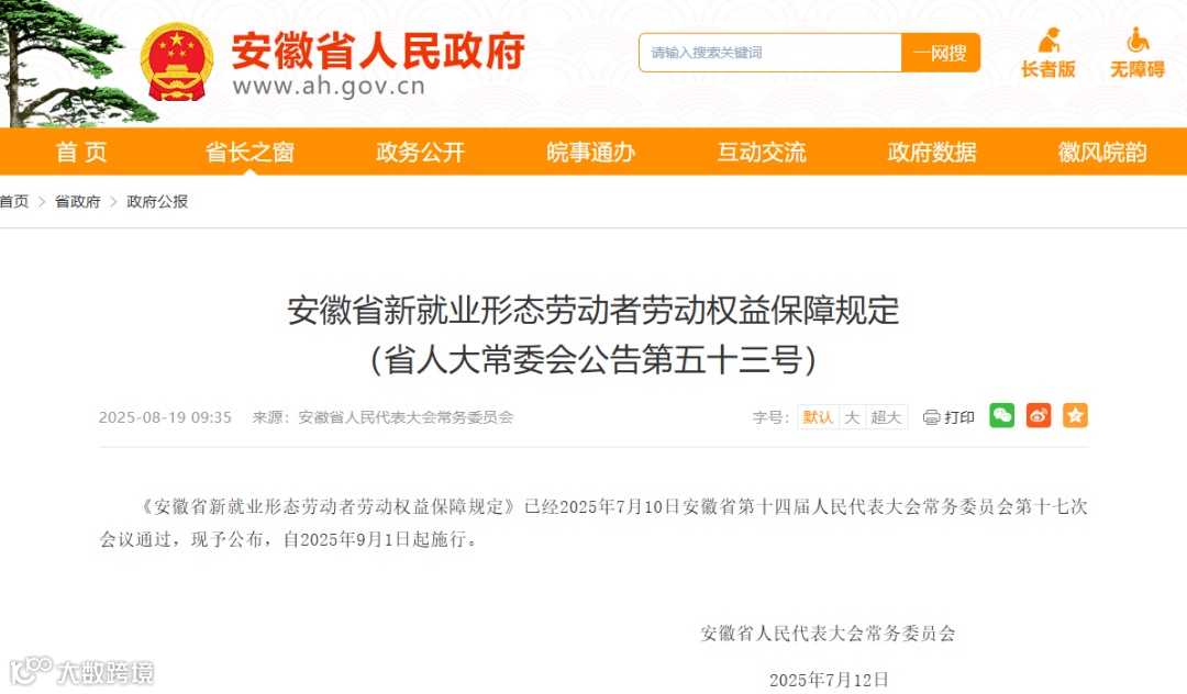 《安徽省新就业形态劳动者劳动权益保障规定》将于2025年9月1日起施行。明确平台企业不得以签订其他协议方式规避劳动合同义务,应依法为符合条件的劳动者缴纳社保。同时要求建立劳动者申诉机制和客户投诉处理机制,保障新就业群体合法权益。