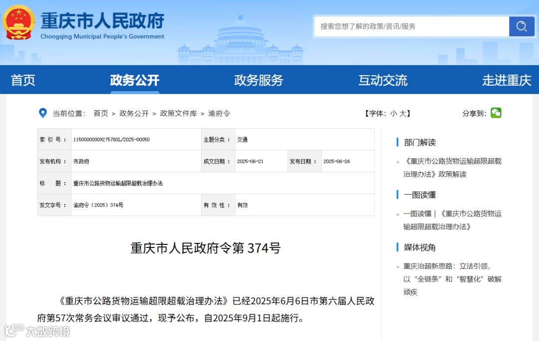 《重庆市公路货物运输超限超载治理办法》将于2025年9月1日起施行。明确“协同治理、源头治理、依法治理、智慧治理”原则,强化对货源地、场站、物流园区等重点源头单位的监管,推动全市统一的超限超载治理数字系统应用,加强路面执法与源头追溯联动,压实企业、经营者及驾驶员主体责任。