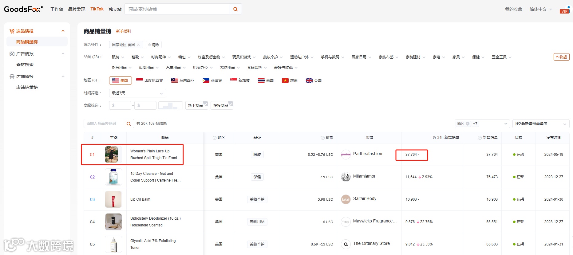 Partheafashion 一款连衣裙近期在 TikTok 美国地区热卖,它是一条黑色的蕾丝连衣裙。据 GoodsFox 数据显示,在 TikTok 美国地区,6月27日该产品日销量达到了37764。