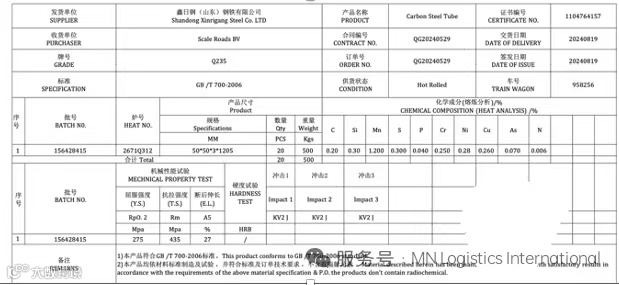 - 附上MILL测试报告或出口证书以验证原材料来源