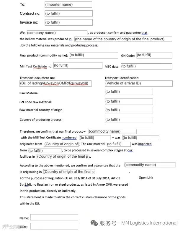 - 需在公司信笺上出具声明:“兹有…[公司名称]…确认已知悉根据欧盟法规(EU) 2023/956的CBAM产品申报义务。”