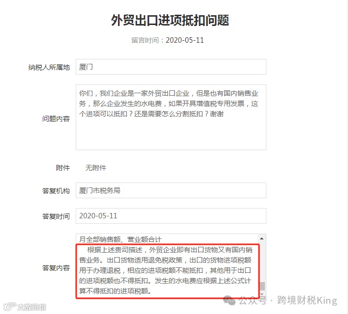 兼营内外销企业:出口业务对应的国内运输费用进项税不可抵扣;其他共用费用(如租金、水电)需按比例划分不得抵扣的进项税额,计算公式如下: