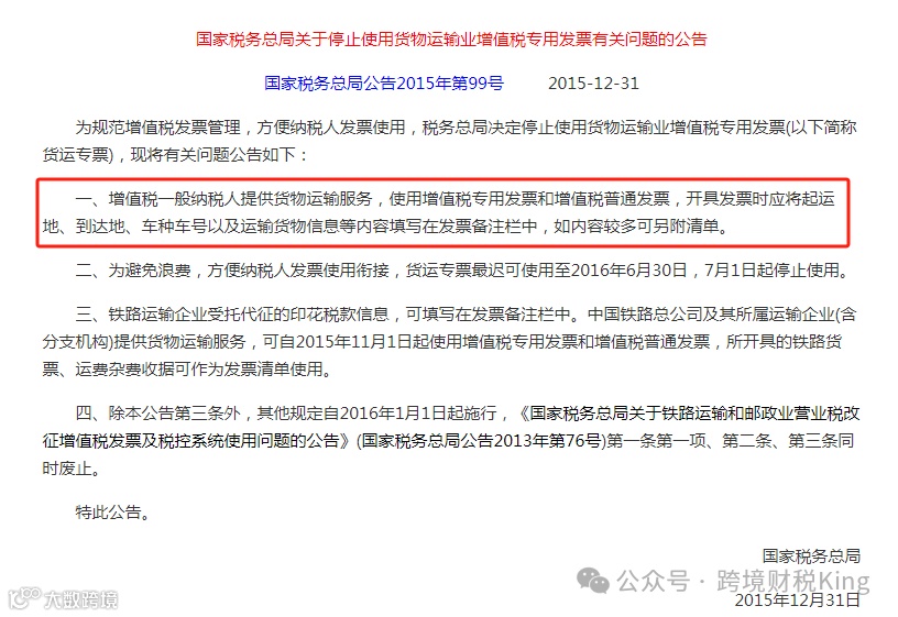 01 国内运输发票备注栏填写要求根据《国家税务总局关于停止使用货物运输业增值税专用发票有关问题的公告》(国家税务总局公告2015年第99号),增值税一般纳税人提供货物运输服务,开具发票时须在备注栏注明起运地、到达地、车种车号及运输货物信息,内容较多可另附清单。