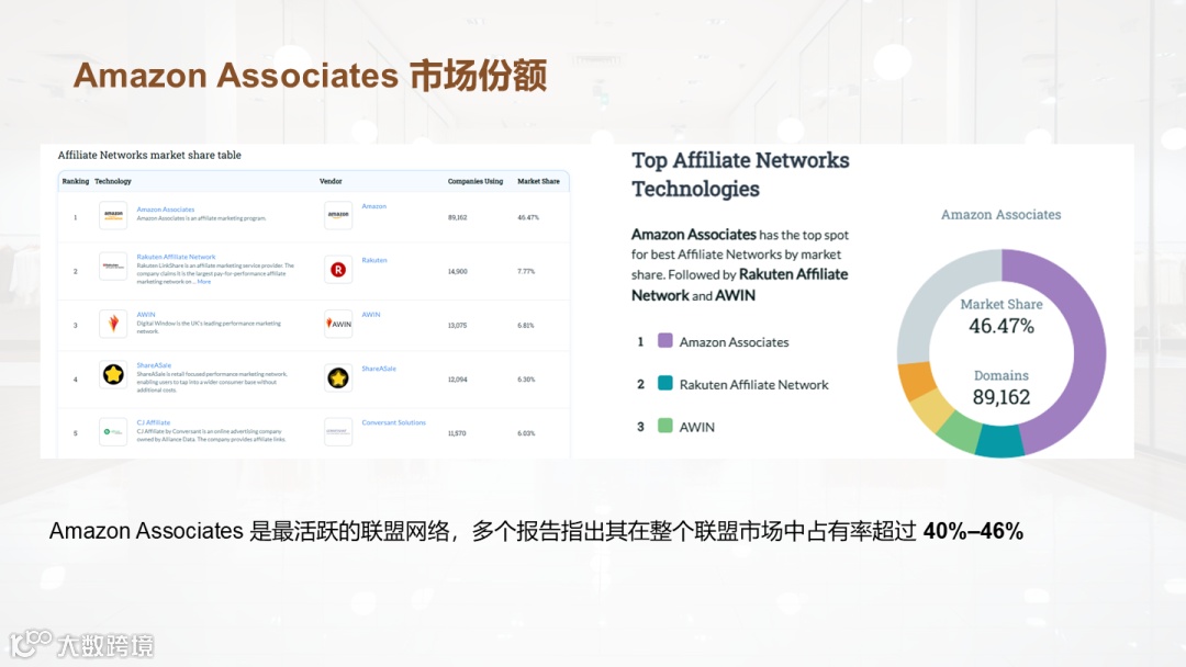 Amazon Associates 是全球最大联盟平台之一,占据40–46%市场份额。