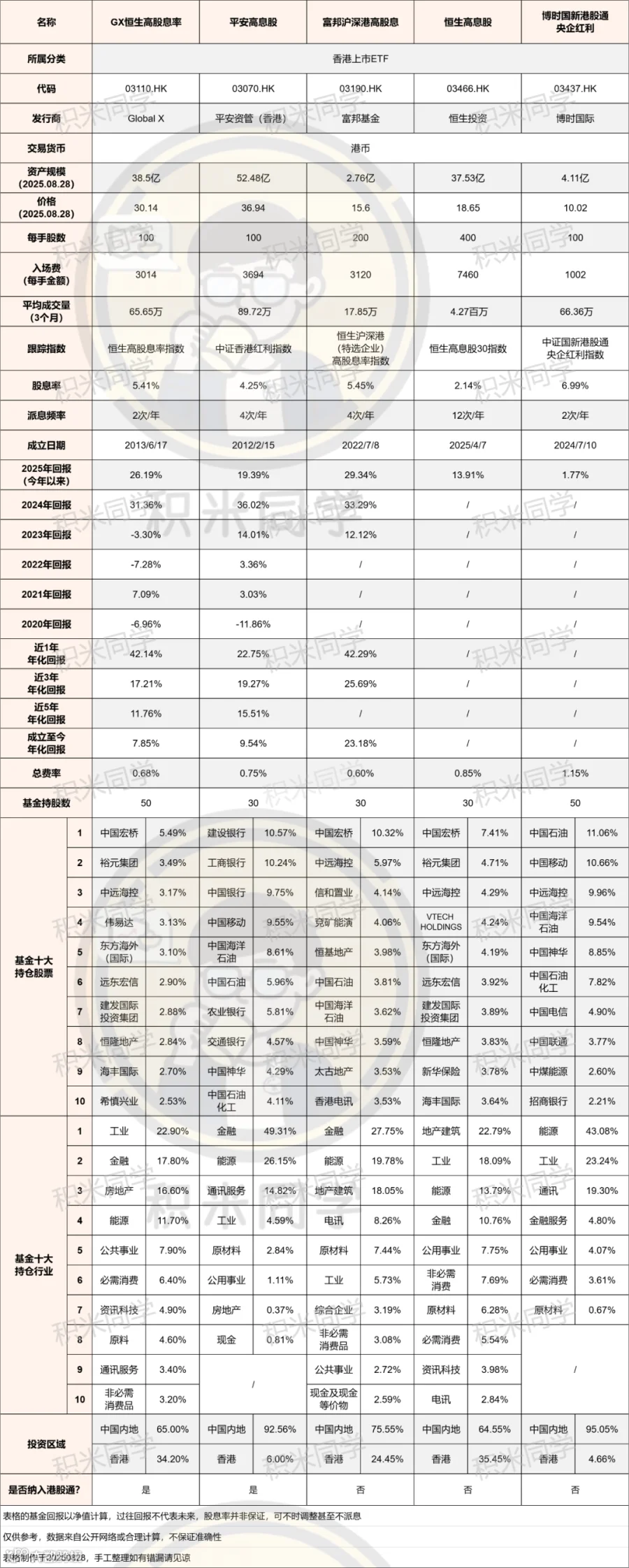 五只产品均聚焦中国内地与香港市场的高股息资产,具备派息特性。 从规模看,平安(52亿)、GX(38.5亿)和恒生(37亿)居前,富邦与博时规模较小。 交易流动性方面,富邦成交量最低,存在流动性风险。 派息频率上,仅恒生高息股为每月派息,其余多为季度或半年度派息。 历史回报方面,GX与平安因成立时间较长,自成立以来年化回报分别为7.8%和9.54%,表现相对稳健。 行业集中度差异明显:平安近半持仓为金融股,博时超40%配置能源,其余三只行业分布更均衡,有助于分散风险。 投资渠道方面,GX与平安可通过港股通投资,其余需通过港股账户交易,需注意交易机制与汇率风险。 本文仅作为学习交流之用,不构成任何投资建议。所有数据截至2025年8月28日,投资有风险,跨境投资需谨慎。
