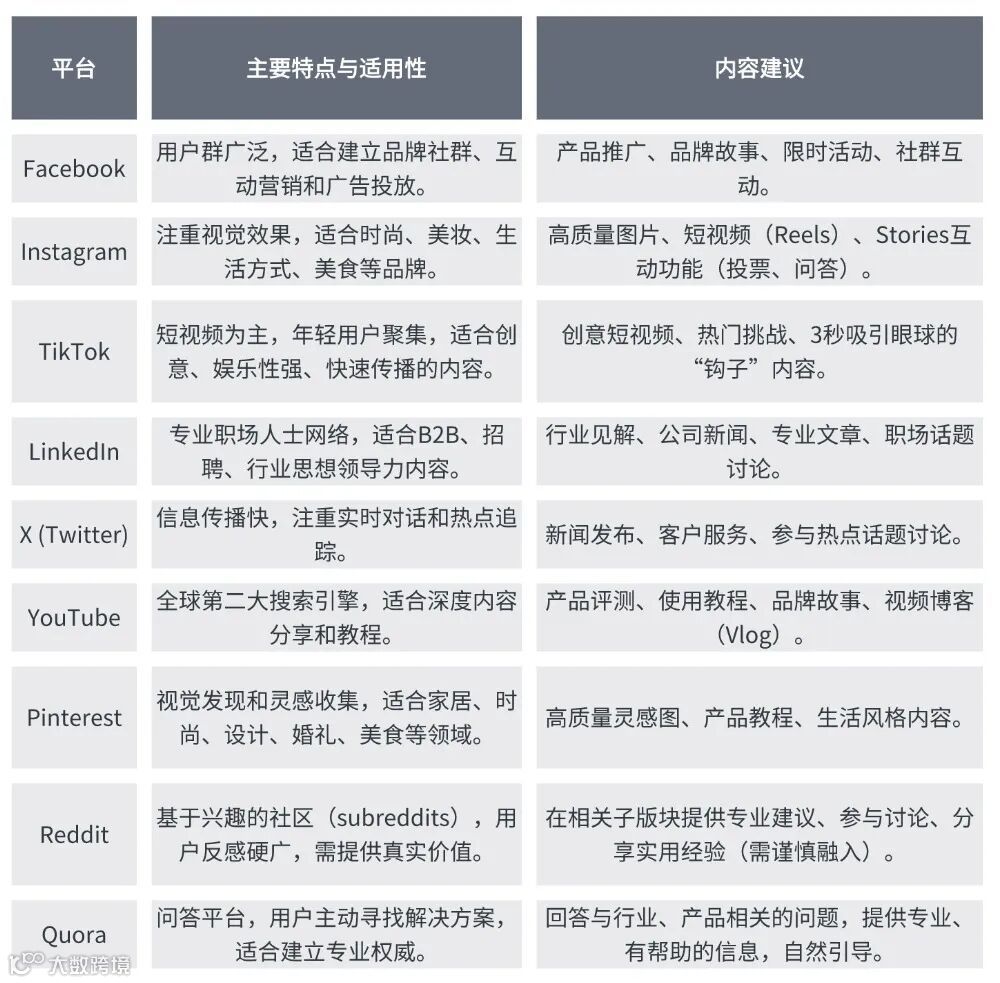 - B2C品牌:优先选择视觉化、年轻化平台,如Facebook、Instagram、TikTok。
