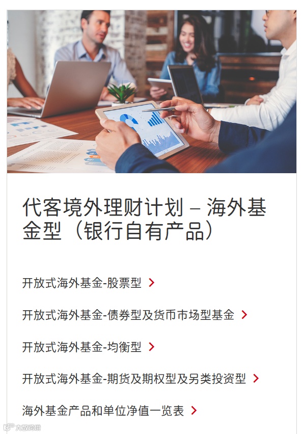 内地汇丰提供定期存款、货币基金、银行理财、代客境外理财(含海外债券与基金)、跨境理财通及保险代销等多元化服务。