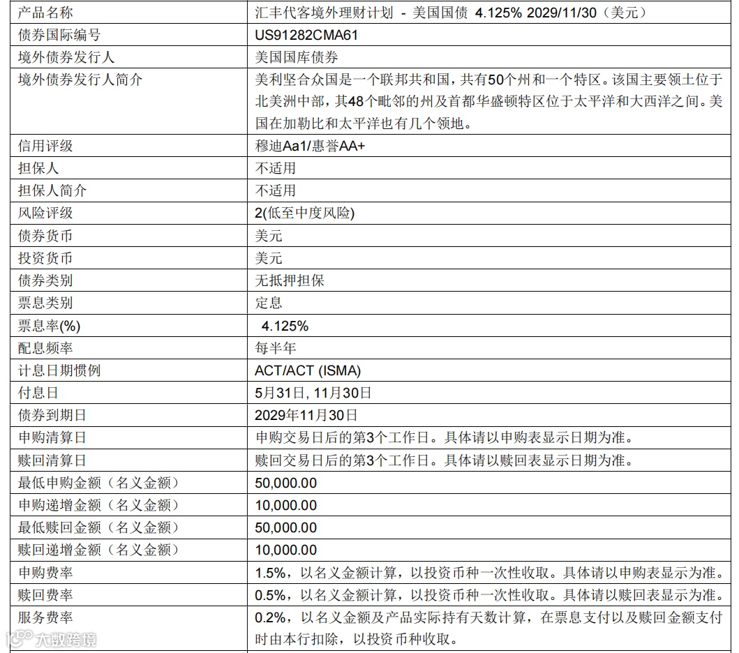 以某款美国国债产品为例:期限至2029年11月30日,票息率4.125%,起投金额5万美元,申购费1.5%,赎回费0.5%,服务费0.2%。扣除各项费用后,预估年化收益率仍在3%以上。