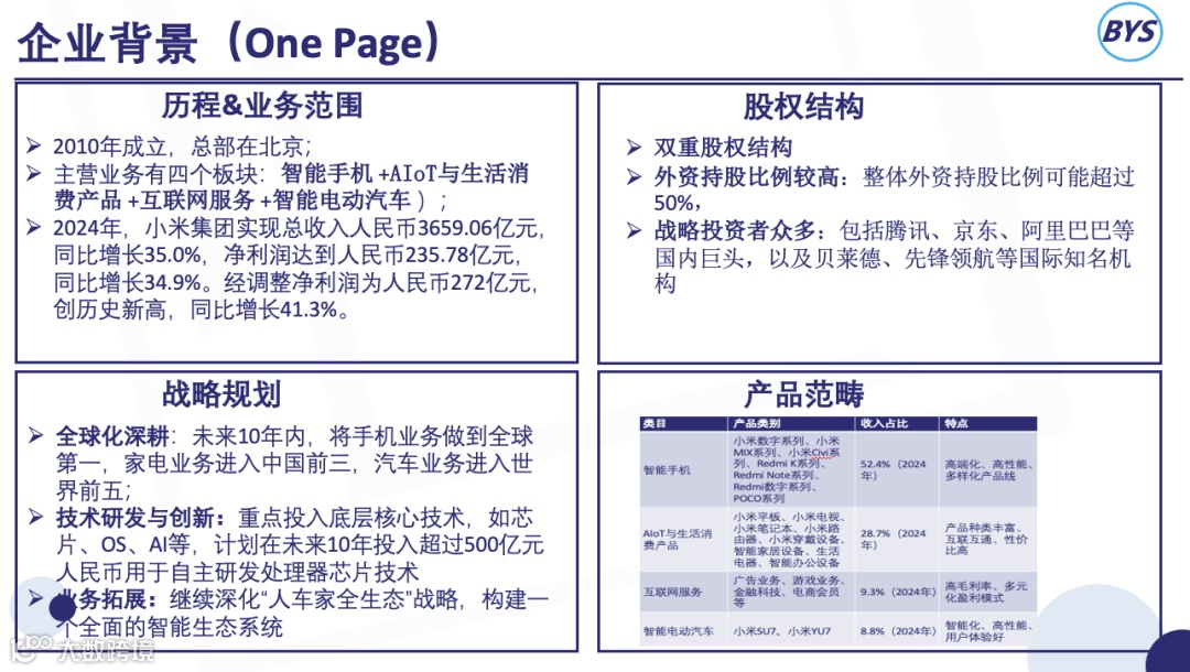 股权结构方面呈现三大特征:一是采用AB股架构,雷军等创始人掌握高投票权,确保决策主导权;二是外资持股比例超50%,美国资本在前十大股东中占比较高;三是引入腾讯、京东、阿里及贝莱德、先锋领航等战略投资者,实现资本与业务协同。