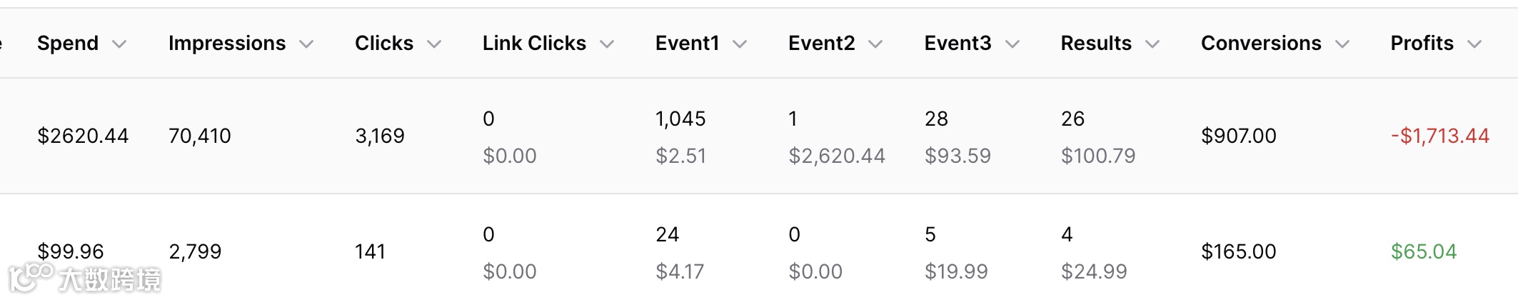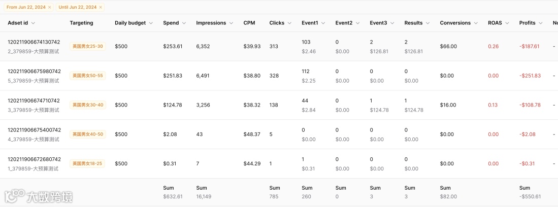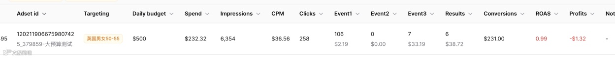 这些是两天的数据。其中低预算组消耗,转化,利润都很稳定,可以长期赚钱了。因此不再进行多余分析,下面咱们对高预算组两天数据进行拆解: