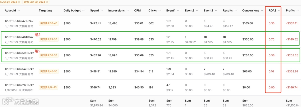 可以看到组2及组5有持续投放的空间,其中组2在21日晚已经实现盈利。组5也已经跑平。