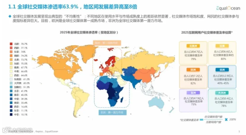 欧美用户付费能力强,但监管严格,文化多元;拉美日均使用超3小时,社交电商潜力大,政策趋严;中东年轻人口占比高,移动渗透率超90%,宗教文化影响显著;东南亚移动优先,社交渗透率超75%,监管碎片化;非洲平均年龄仅19岁,增长空间大,但面临数字鸿沟与监管分散挑战。
