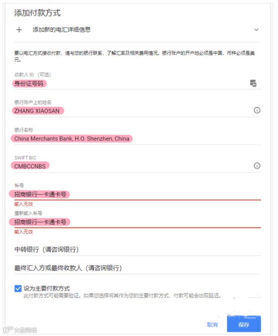 目前中国大陆用户常用招商银行电汇方式接收境外付款。在AdSense付款设置中添加电汇信息,具体填写方式如下图所示: