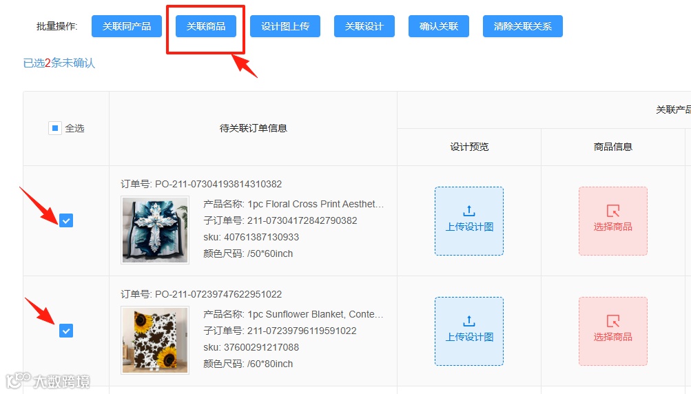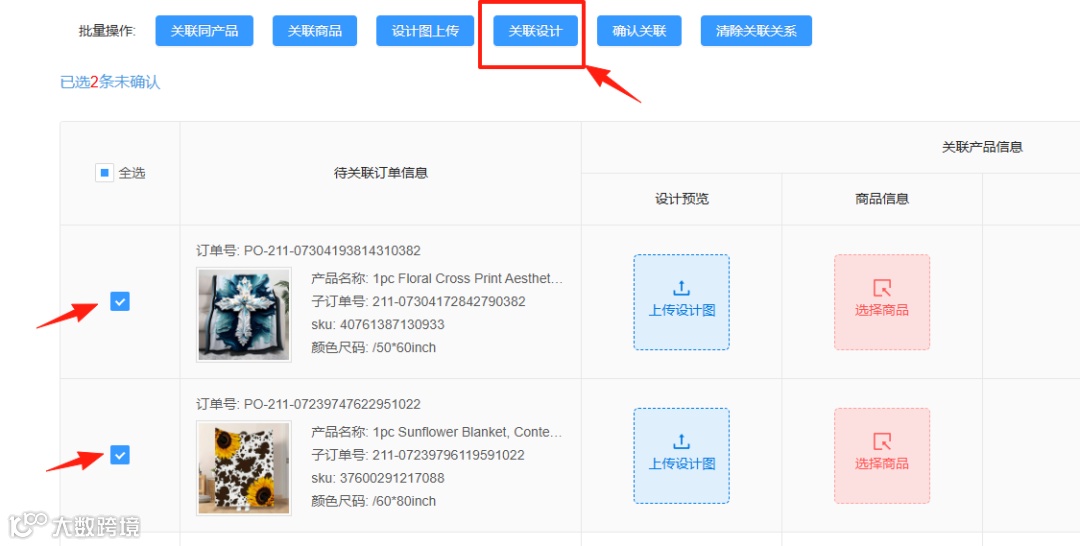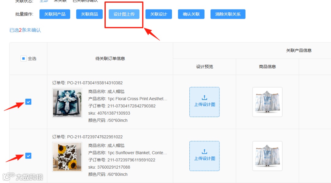 支持为多个订单批量上传或选择同一设计图,适用于多商品共用同一图案的场景(订单仍为“未关联”状态)。
