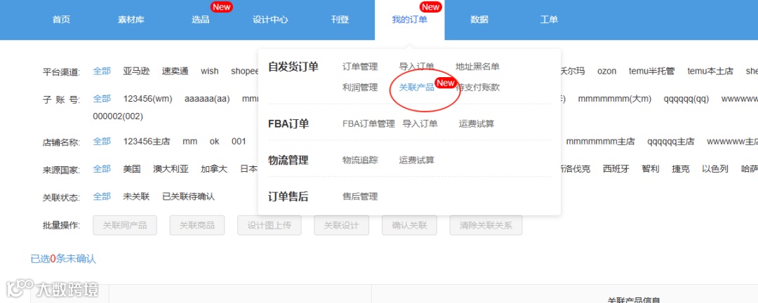 在页面中可按平台渠道、子账号、店铺名称、国家及关联状态筛选订单,并执行以下批量操作: