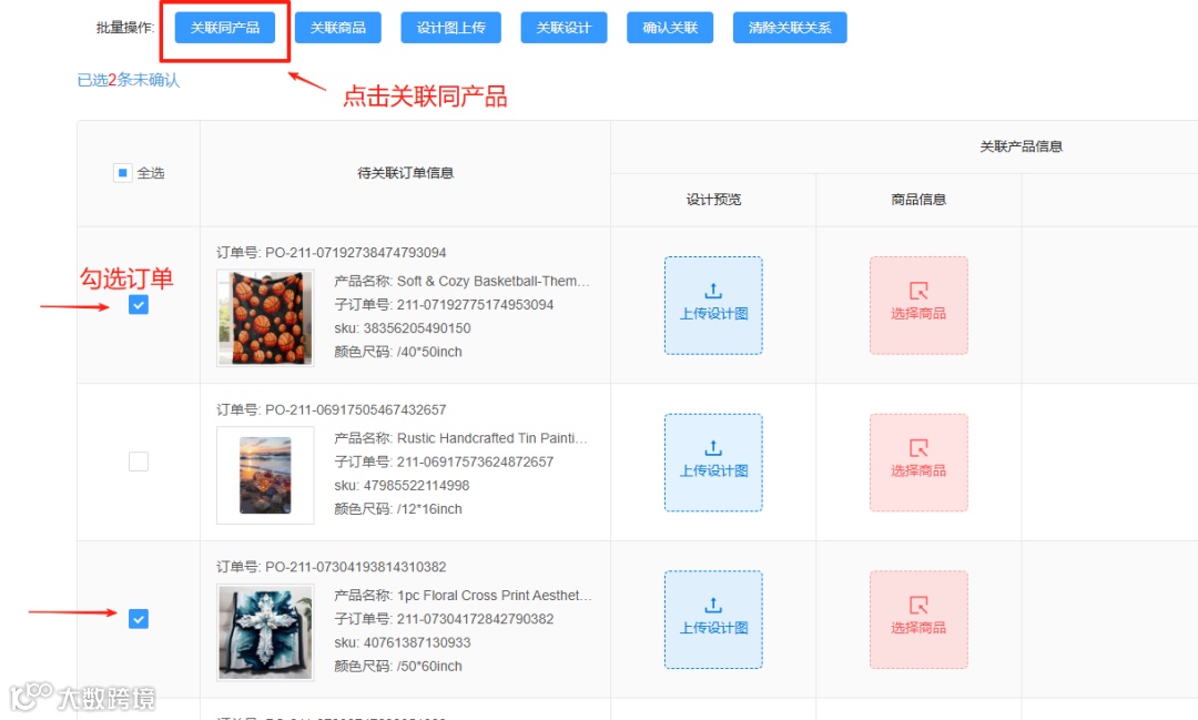 对已完成产品信息绑定的订单,勾选后点击【确认关联】,系统将校验商品、设计图和规格完整性,校验通过则进入“未付款”状态。