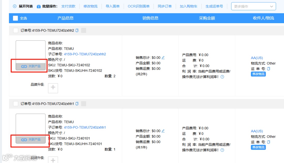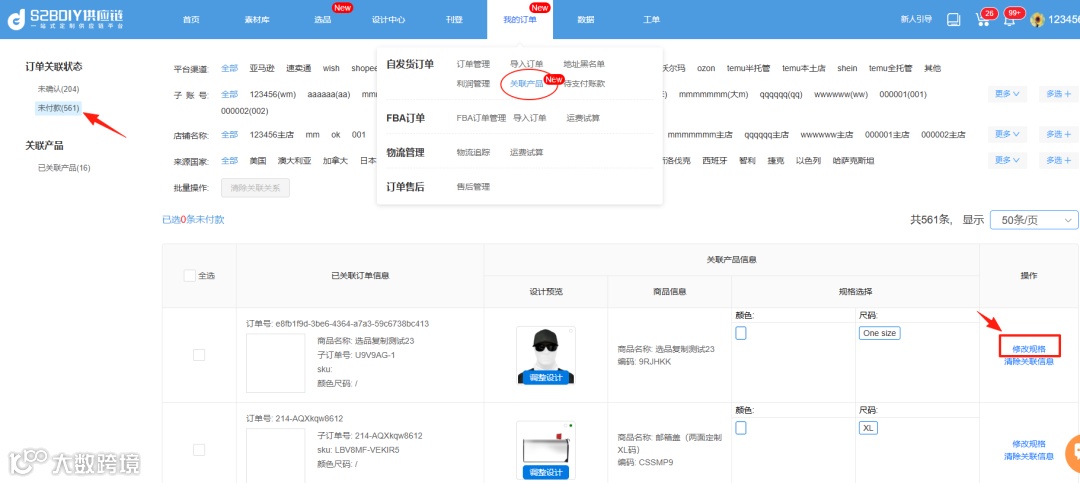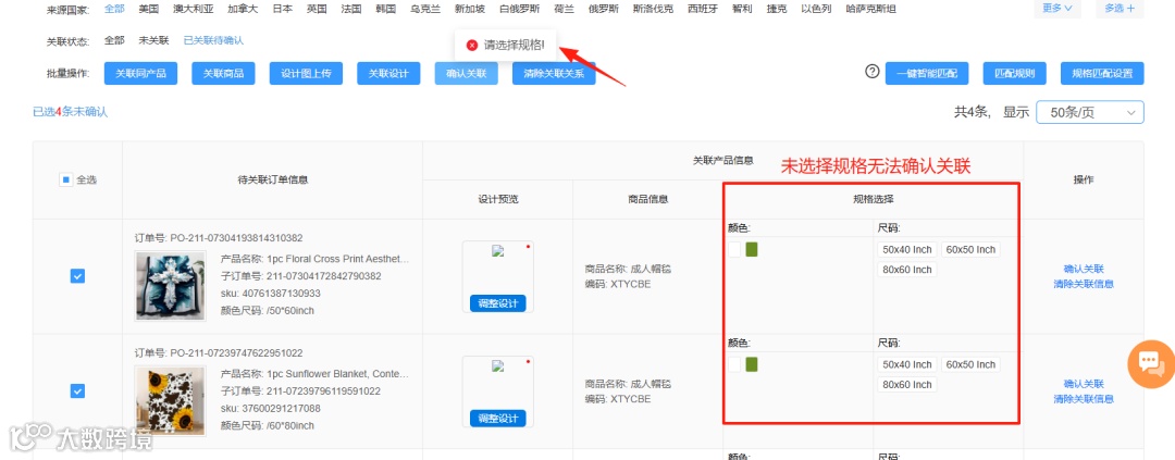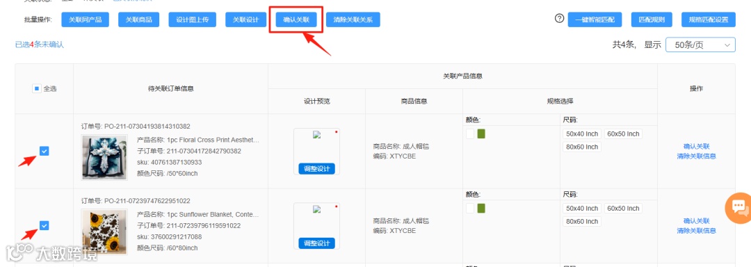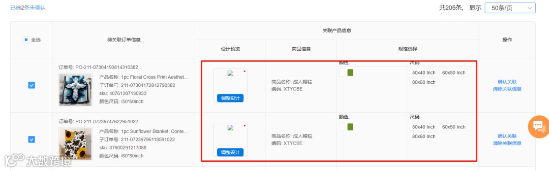 除批量操作外,卖家也可在“未确认订单”列表中对单个订单进行商品、设计图、设计或产品的单独关联。