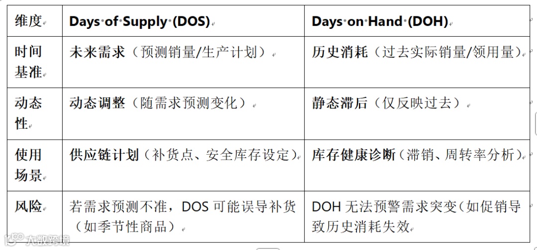 结论:若仅依赖DOH(50天),易误判库存充足;而DOS(20天)则提示需及时补货,避免断货风险。