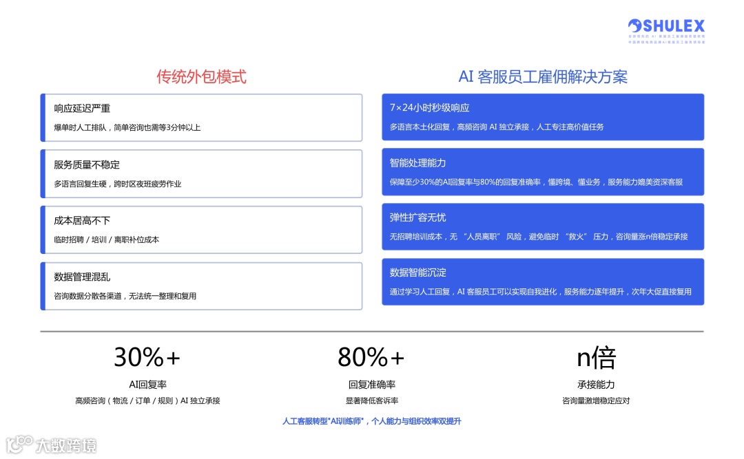 2025年被视为AI Agent应用的“爆发元年”。凭借知识密集、流程标准化及多语言、跨时区沟通需求,跨境电商客服成为AI落地的核心场景之一。全球已有近千家企业投入客服AI Agent的技术创新,而Shulex作为中国跨境电商品牌AI客服服务的领导者,已为超百家头部品牌提供AI客服员工解决方案,涵盖安克创新、致欧家居、追觅科技、遨森电商、元鼎智能、ESR亿色、库犸科技、国贵科技等行业领军企业,以及PLAUD、盖世小鸡、灏米科技、泽鹿视界、奥深、欧易、杰西亚家居等新兴品牌。