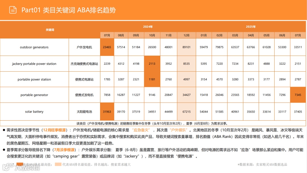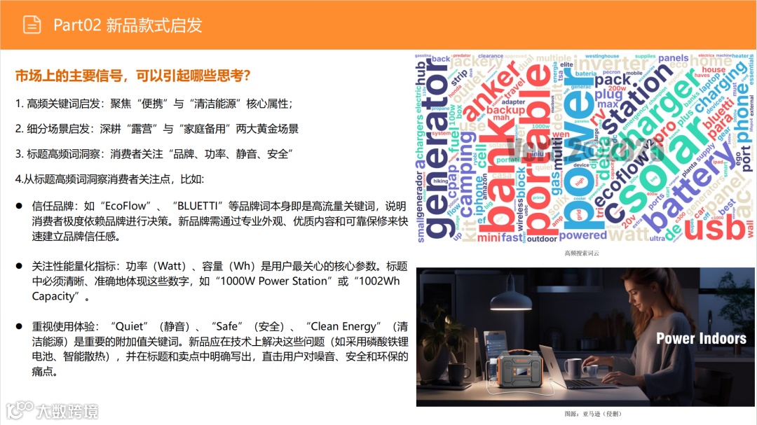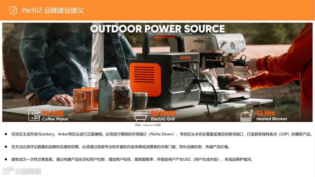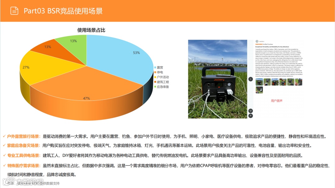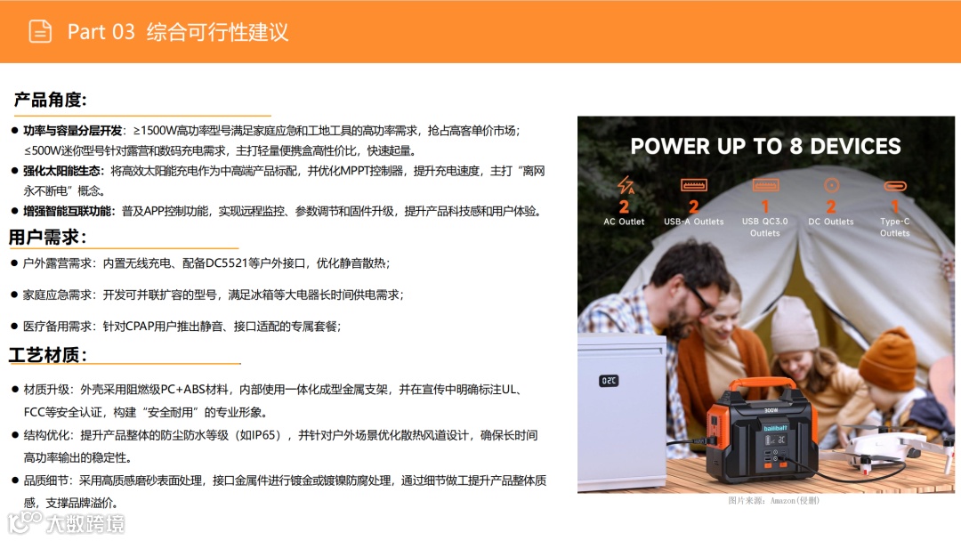 尽管户外市场(搜索占比53%)竞争激烈,但需求稳定。应避免通用化红海,聚焦细分场景:如为钓鱼用户优化静音性能、为精致露营适配咖啡机功率、为房车用户提供专用接口。通过精准定位细分人群,强化便携性与产品设计,实现差异化突围。 -