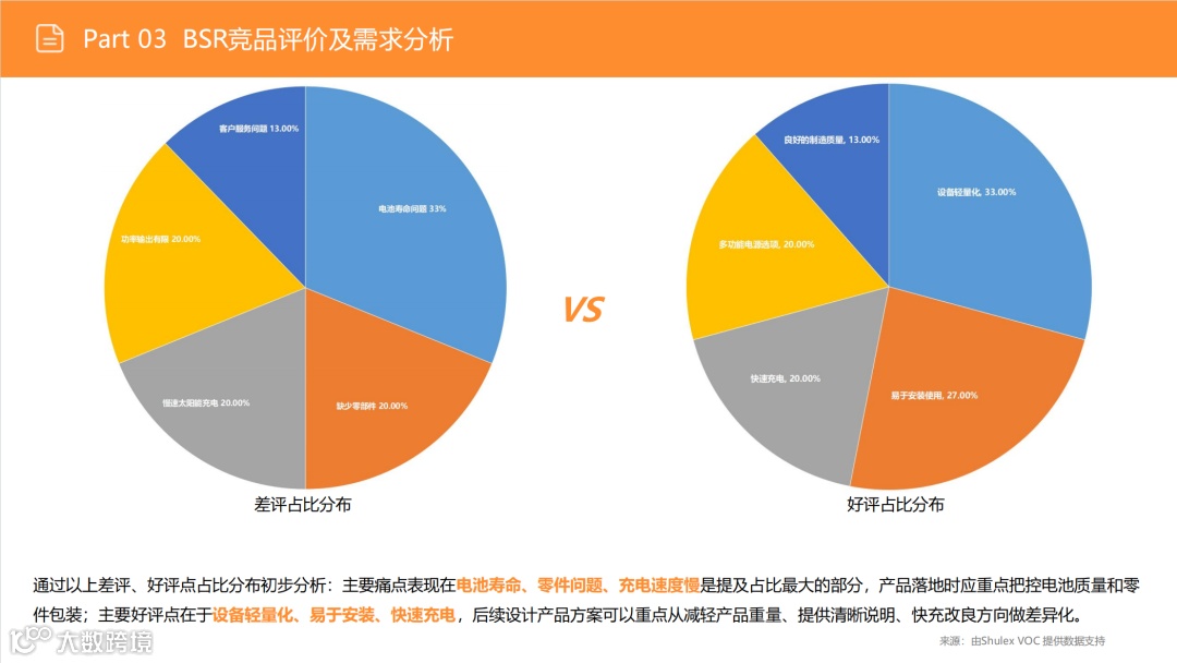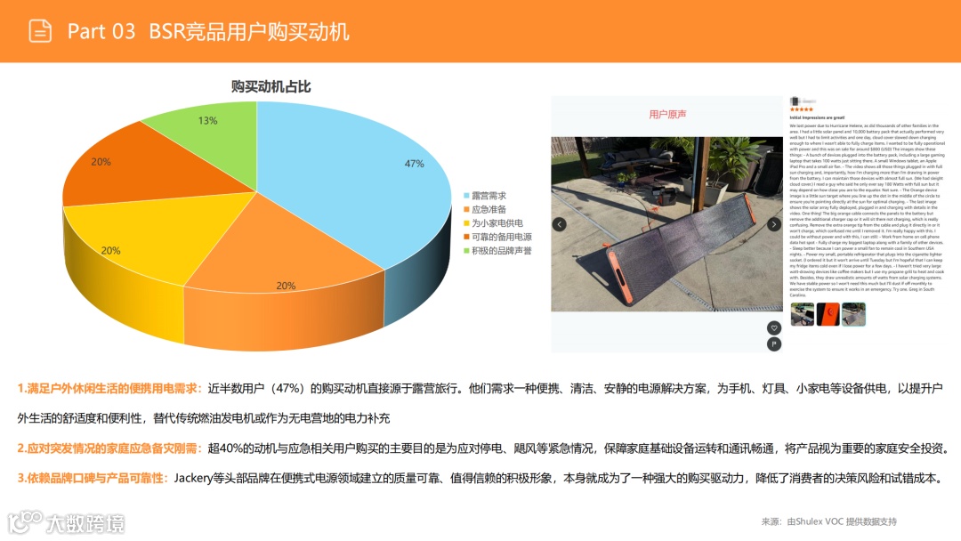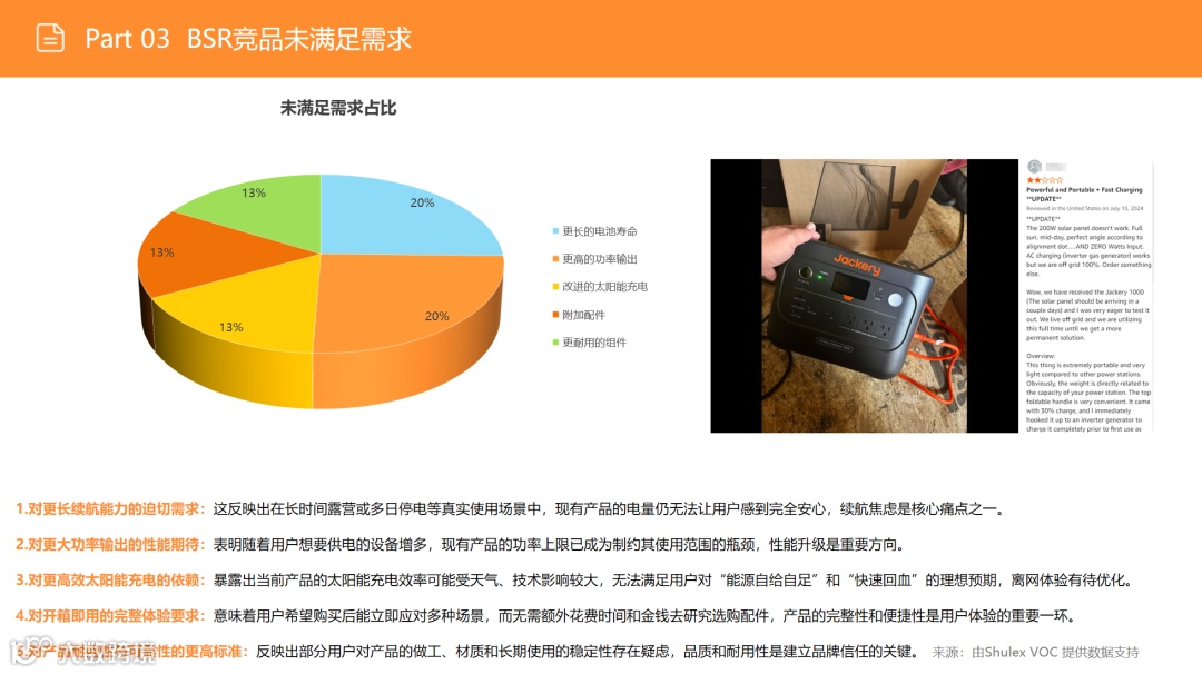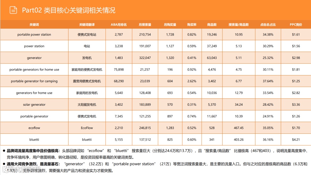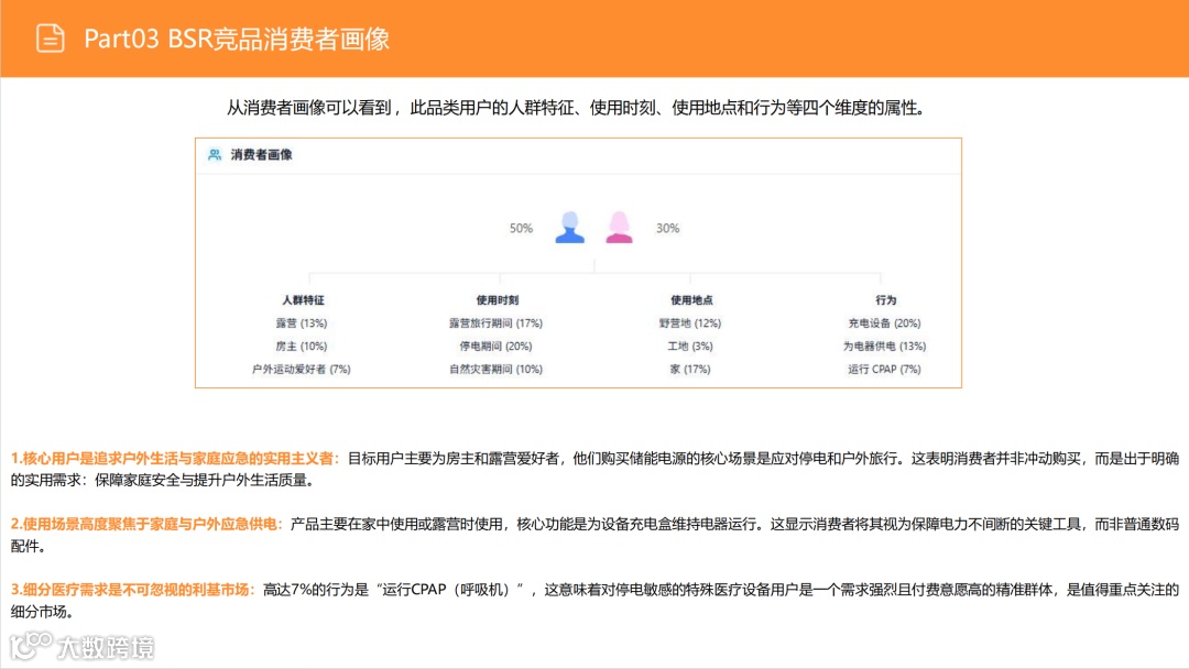 尽管户外市场(搜索占比53%)竞争激烈,但需求稳定。应避免通用化红海,聚焦细分场景:如为钓鱼用户优化静音性能、为精致露营适配咖啡机功率、为房车用户提供专用接口。通过精准定位细分人群,强化便携性与产品设计,实现差异化突围。 -