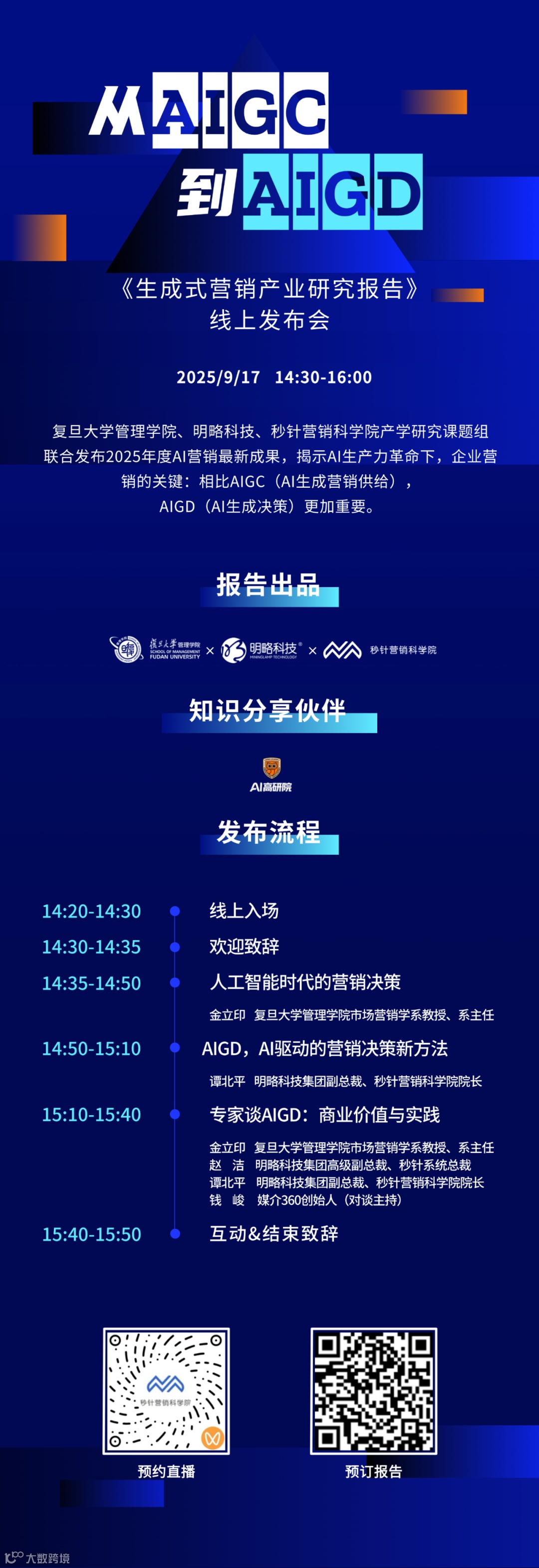 发布会上,来自复旦大学管理学院市场营销学系、秒针营销科学院及明略科技的专家将权威解读报告核心内容,涵盖AI时代营销决策框架、AIGD方法论与企业工作流整合、实际应用案例等。