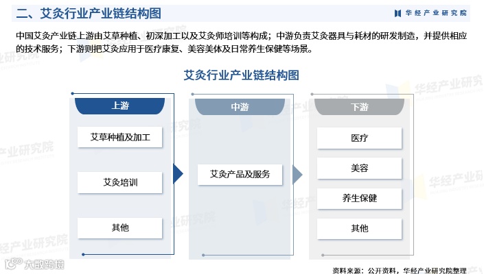 中国艾灸产业链结构清晰:上游涵盖艾草种植、初深加工及艾灸师培训;中游聚焦艾灸器具与耗材的研发制造及技术服务;下游广泛应用于医疗康复、美容美体及日常养生保健等场景。
