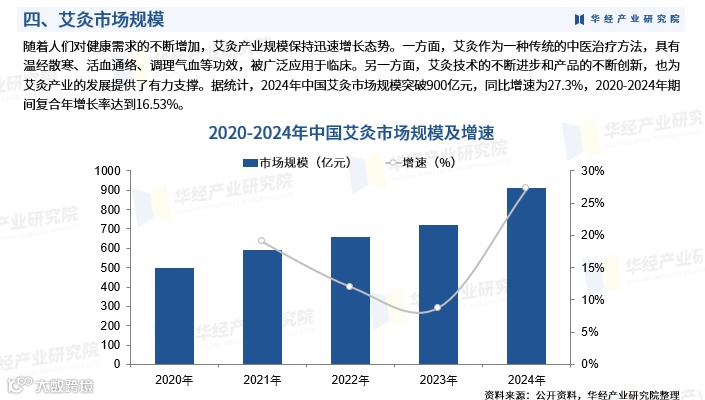 随着居民健康意识提升,艾灸市场需求持续增长,产业规模迅速扩张。2024年中国艾灸市场规模已突破900亿元,同比增长27.3%,2020年至2024年复合年增长率达16.53%。技术进步与产品创新进一步推动行业高质量发展。