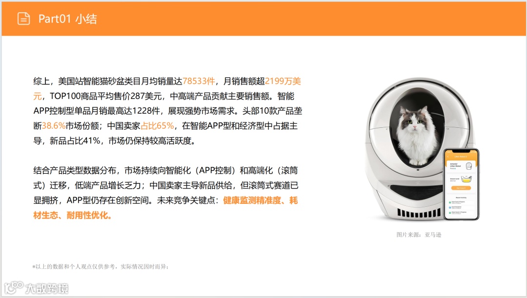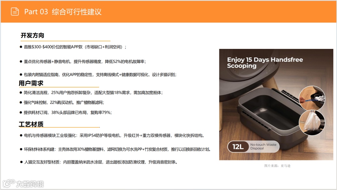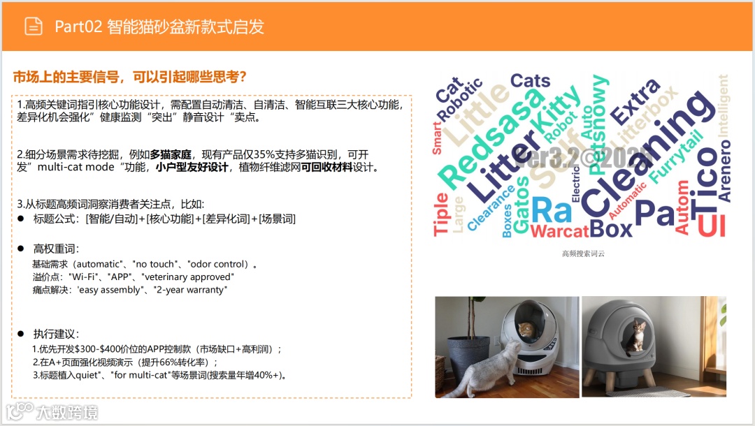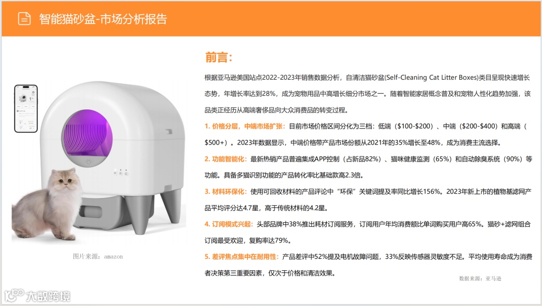 本报告基于亚马逊美国站TOP100商品数据、5,000+条用户评论及专利分析,深度解析智能猫砂盆出海三大核心议题:如何突破技术同质化?如何构建高溢价产品力?哪些策略可有效降低运营风险?为品牌提供从产品开发到渠道落地的全链路实战指南。
