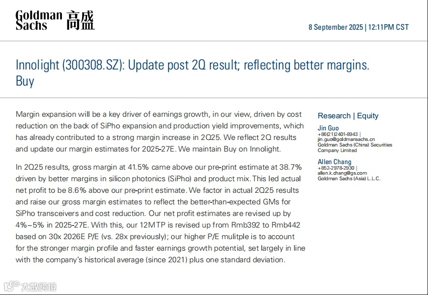 在2025年二季度业绩中,公司综合毛利率41.5%,高于我们印刷前估计的38.7%,主因是硅光业务毛利率更佳与产品结构优化。这使得实际净利润较我们预估高出8.6%。我们纳入2Q25实际结果并上调毛利率假设,以反映SiPho收发器更好于预期的毛利与成本下降;我们对2025-27年净利润预测上调约4%~5%。基于此,我们将12个月目标价由392元上调至442元,对应2026年30倍市盈率(此前为28倍);更高的估值倍数主要反映更强的利润率表现与更快的盈利增长潜力,基本与公司自2021年以来的历史均值加一倍标准差相一致。