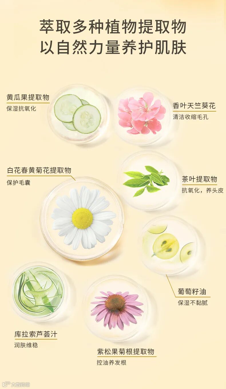 含珍贵的天竺葵花,库拉索芦荟、葡萄籽油、黄瓜果提取、百花春菊花、茶叶提取、紫松果菊根提取...