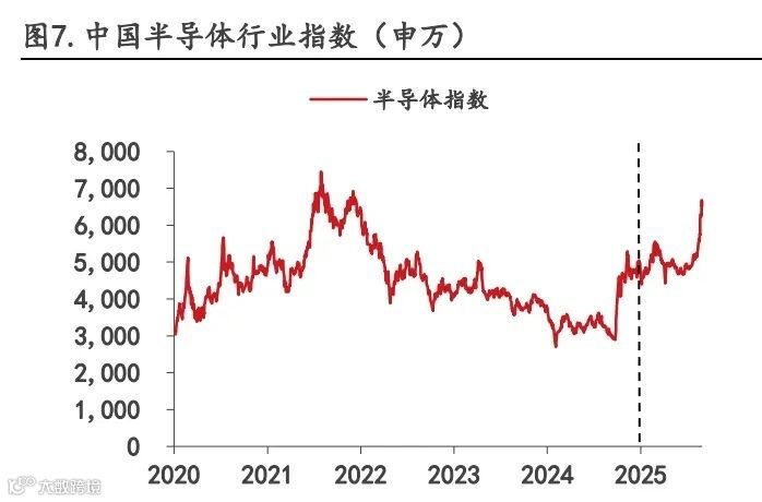 2025年上半年,全球半导体在AI驱动下保持高增长态势。中国半导体板块表现突出,申万半导体指数累计上涨37%,显著高于费城半导体指数14%的涨幅。核心驱动力来自AI算力需求扩张与国产替代加速,政策支持下产业链协同突破,集聚效应增强。