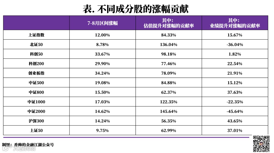 尽管基本面呈现弱修复,但市场行情更多由估值驱动。7月至8月,科创50指数、创业板指涨幅分别达33.67%、34.24%,其中业绩改善贡献极小——科创50成分股业绩对涨幅贡献仅1.82%,估值中枢贡献高达98.18%。