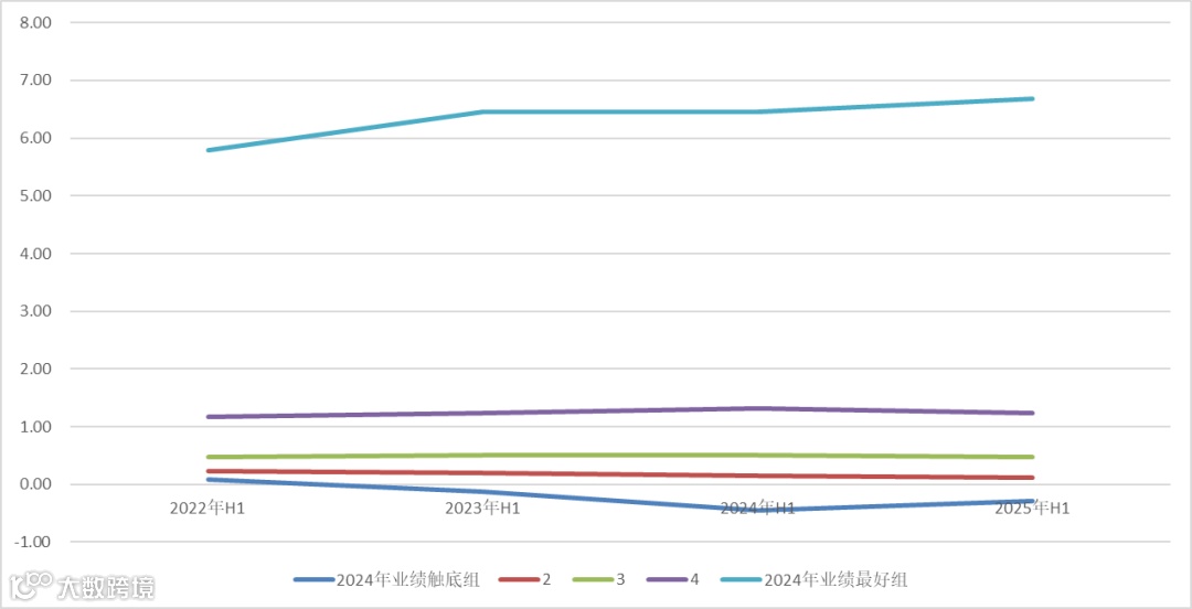 按2024年上半年净利润分组显示,业绩触底组在2025年上半年出现明显修复,底部反弹特征显著。而业绩最优组持续向好,中间组表现平淡,整体呈现“两头强、中间弱”的格局。