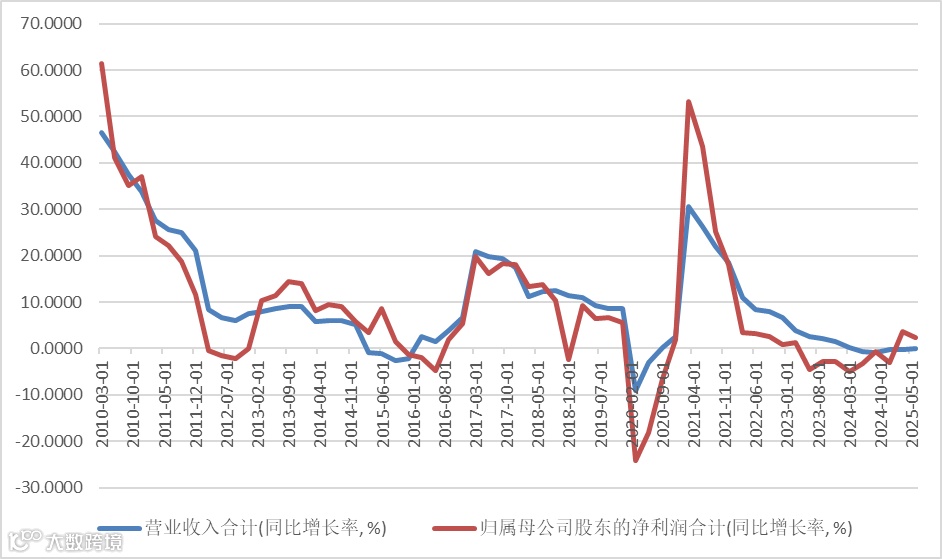 截至8月31日,A股共5425家公司披露2025年半年报。金融学者香帅对财报数据进行梳理,揭示当前上市公司基本面的结构性特征。 整体改善,但增速回落 2025年上半年,上市公司整体营收达34.9万亿元,同比增长2.67%,增速自去年二季度转负后,于今年一季度首次转正。净利润为3.21万亿元,同比增长2.45%,较一季度3.65%的增速有所回落,显示二季度利润增长放缓。 在剔除新上市、ST及市值低于10亿元公司后的可比口径下,企业利润改善呈现U型结构:市值10-50亿元的小市值公司与1000亿元以上的大市值公司改善显著,中等市值企业则表现平平。- 大市值公司利润改善具有持续性,三年累计净利润年均增速为2.84%;