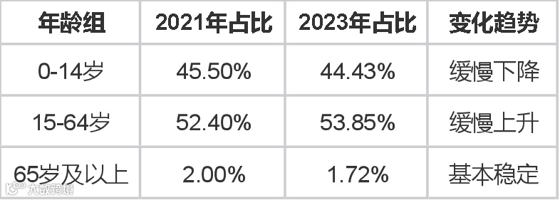 抚养比数据显示:总抚养比85.69%,少儿抚养比82.5%,老年抚养比仅3.19%,表明社会负担较轻,有利于经济可持续发展。
