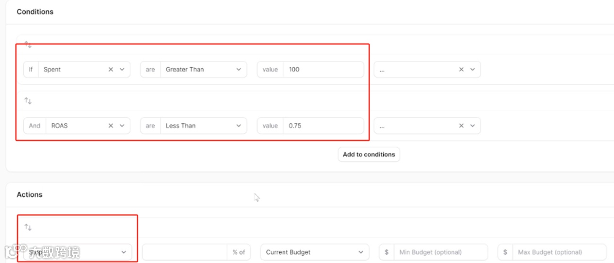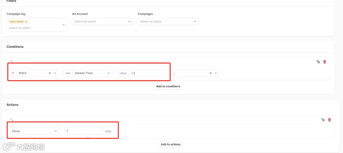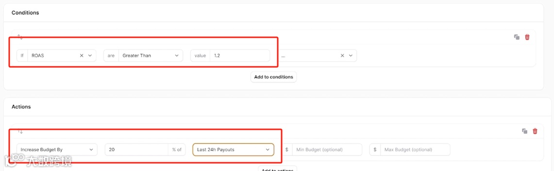 如果你的账户中广告组较多,你也可以借助尤里改系统进行自动监测和调整预算,只需设置好加预算逻辑,比如当roas大于1.2的时候,我们就针对广告增加20%的预算,这样就不会漏掉某条广告