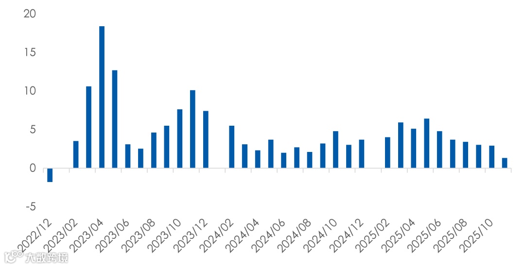 11月中国经济呈现“内冷外热”特征:内需仍承压,社零增速创年内新低,房地产投资与销售延续深度调整;出口受益于非美市场复苏超预期转正,成为亮点。新增社融同比由负转正,但信贷增长仍依赖票据及企业短贷;CPI因食品价格回升至近期高点,PPI同比降幅扩大,反映生产端通缩压力加深。