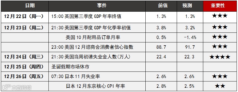 日本央行上周五加息25基点将利率从0.5%上调至0.75%,利率由此达到30年来的最高水平。市场对本次加息已有预期,因此市场完全消化了加息的影响,消息公布后,美元兑日元继续震荡上行,日内最高涨至157.77。对于后期货币政策,日方预计如未来经济走势逐步改善,明年将继续提高利率,与此同时密切关注持续贬值的日元走势。美元兑日元周一亚洲市场围绕157.50附近高位运行,日元贬值迹象明显,本周虽然为圣诞假期,加之日本经济数据平淡,仍要关注美元兑日元可能继续出现的惯性上涨走势,同时日元贬值加剧也需高度警惕日本方面可能随时实施的外汇干预的可能。