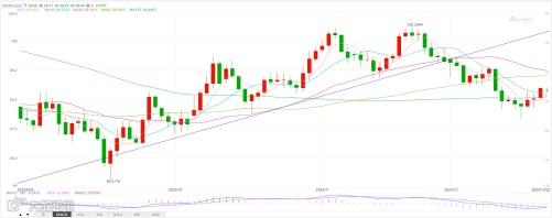 美元兑人民币12月18日最低跌至7.0395,人民币保持升值状态。日线方面观察,近期汇价基本围绕7.04附近窄幅波动,同时也位于7.3515以来的趋势线下方运行。后续如跌势延续,回调目标可参考去年9月26日低点7.0090位置。周内观察,汇价下行走势保持较好,而美指反弹走势仍然趋弱,如果美指在反弹过后再度陷入调整,届时美元兑人民币大概率仍有望进一步下行。此外上方可关注趋势线位置的压力(7.0480),预计该位置短期突破概率并不高。