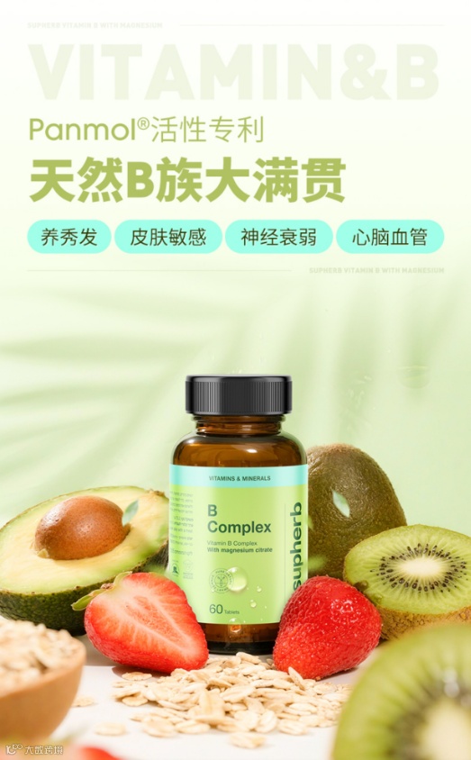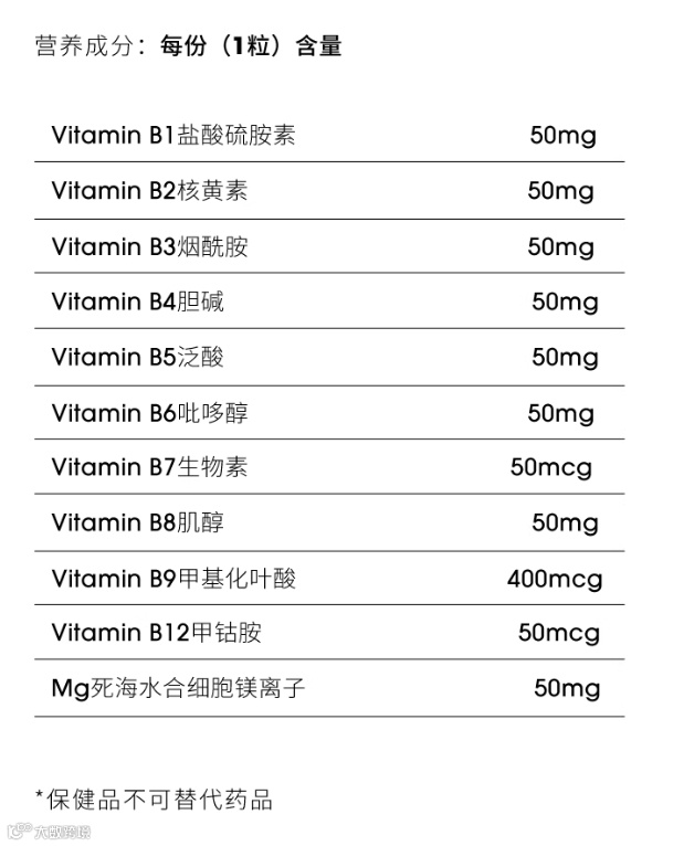 每片都含10种B族!有提高代谢精力的B1、B5、修复神经的B12,养护头发的B7以及别家都没有的胆碱和肌醇!这两种营养,有助于养护脑神经,坐骨神经,唤醒脑活力,保护小肝肝!除此之外,还添加了以色列死海提取的矿物质镁,能改善睡眠,强健骨骼,舒缓焦虑!