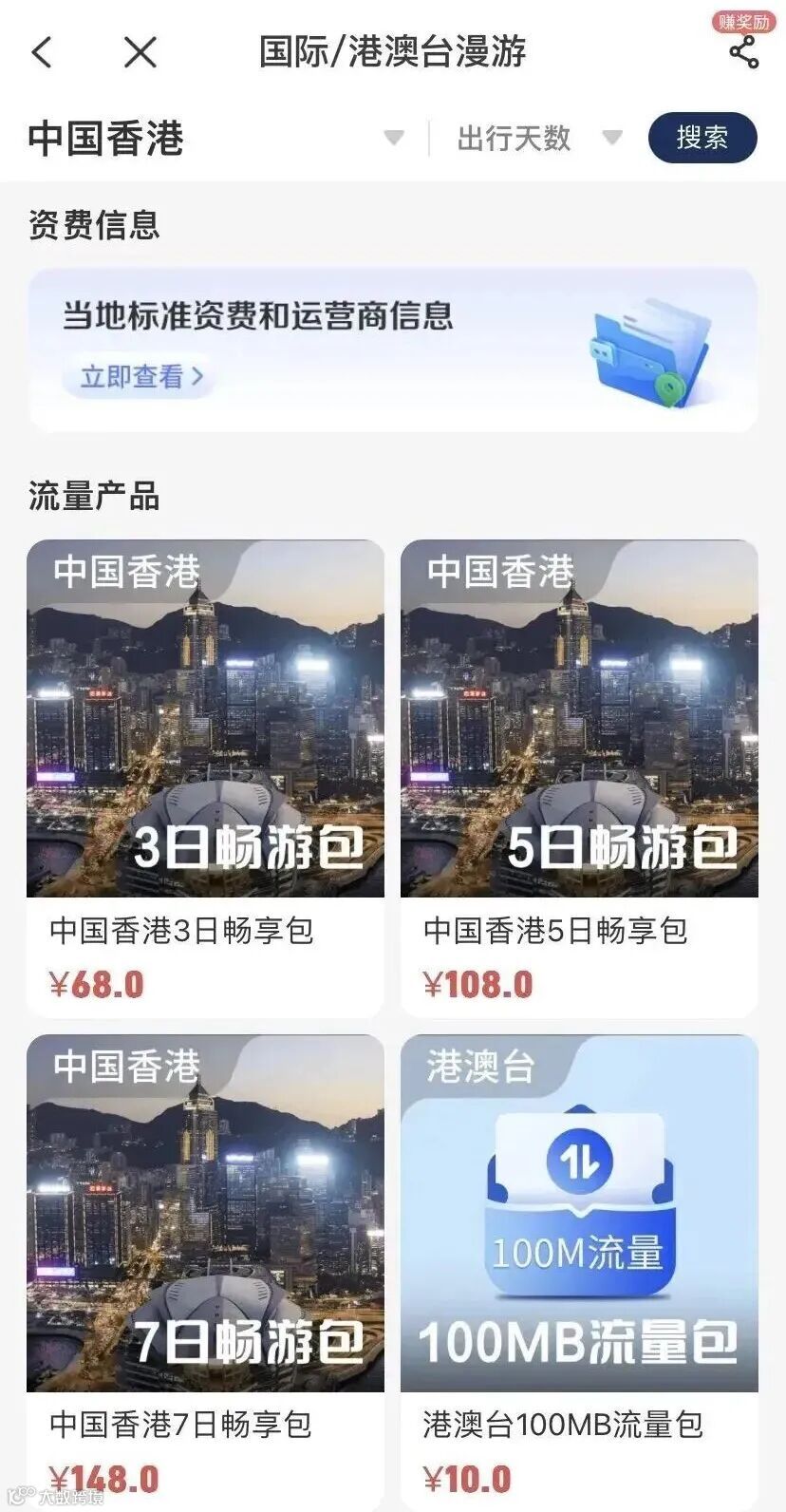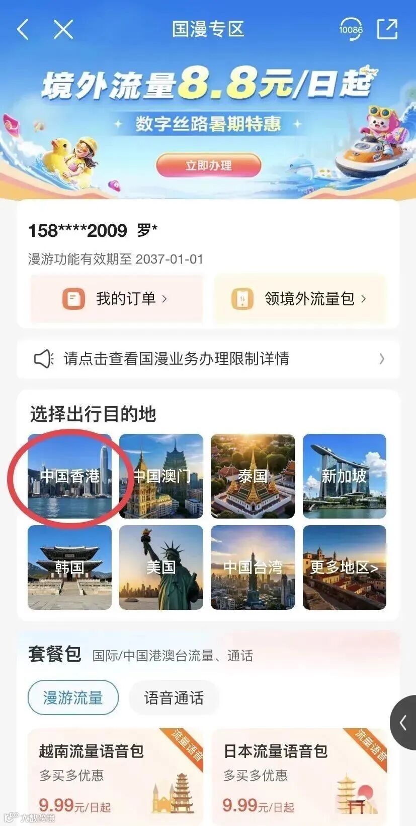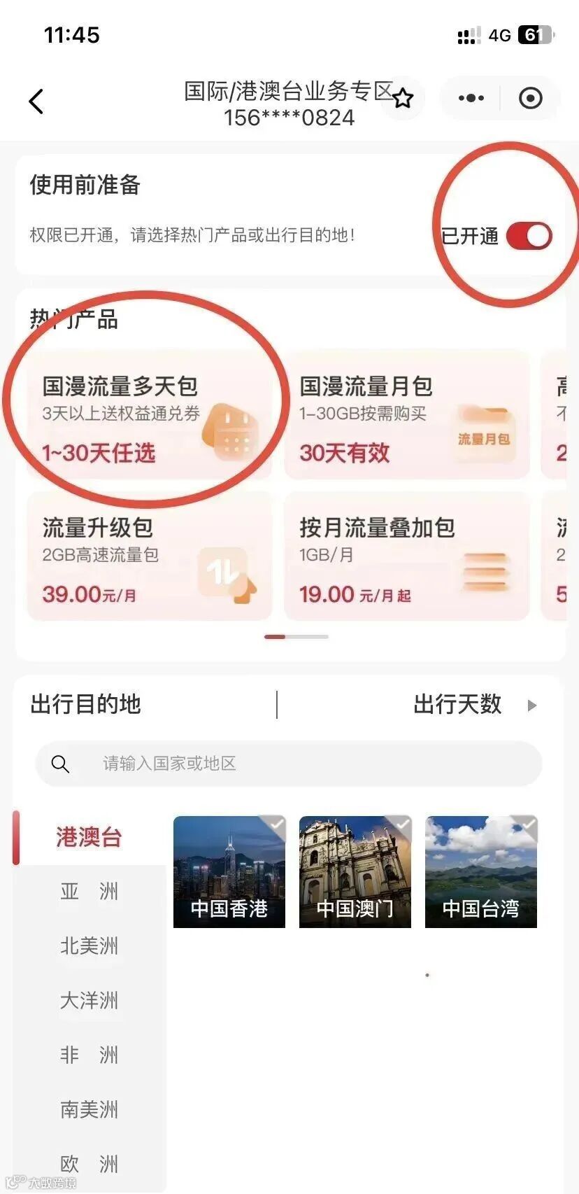 - 返回页面进入“国际漫游专区”,选择目的地并订购合适流量包。