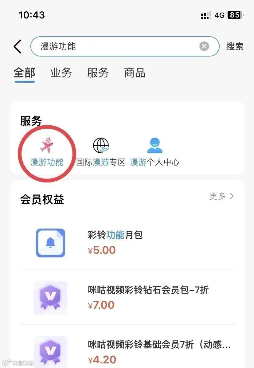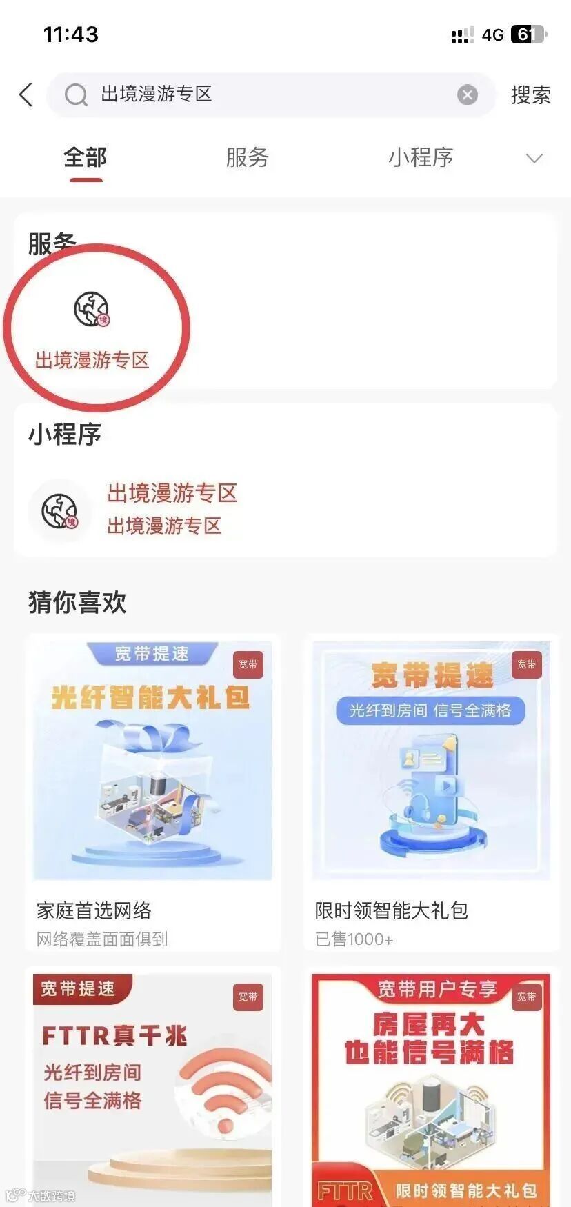 - 搜索“漫游功能”,点击进入并选择“在线办理”;