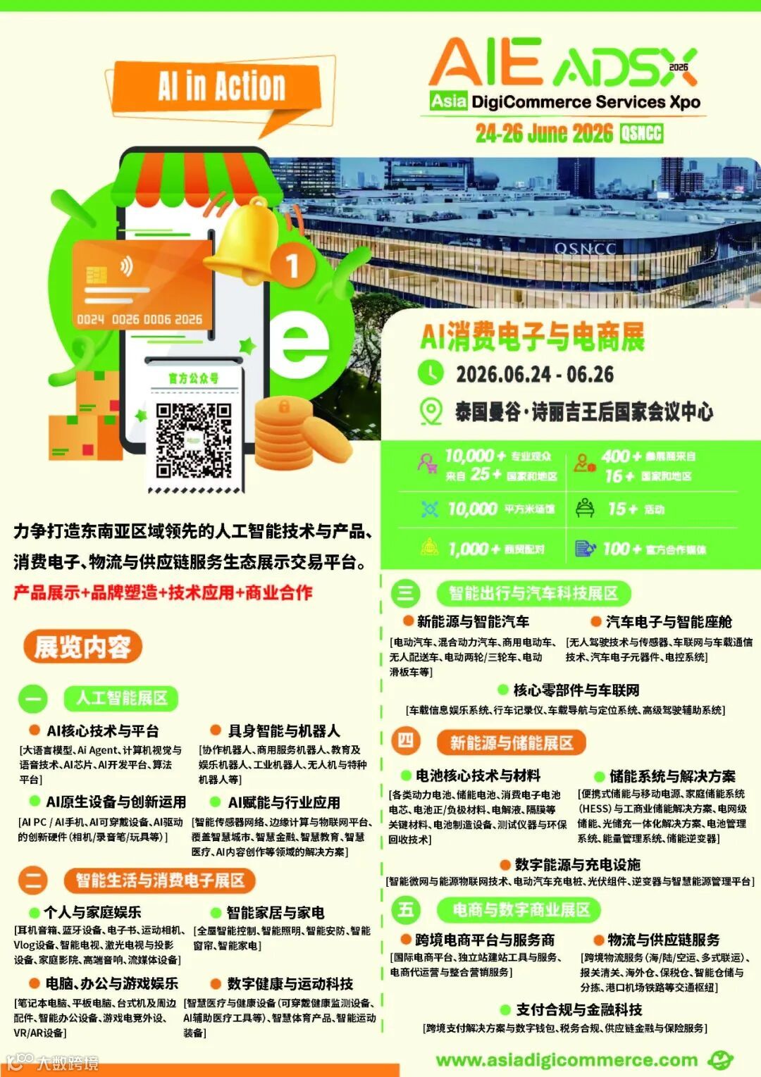 展会将于2026年6月24日至26日在泰国曼谷诗丽吉王后国家会议中心举行,设置人工智能、智能生活与消费电子、智能出行与汽车科技、新能源与储能、电商与数字商业五大展区,精准对接东南亚市场需求升级。